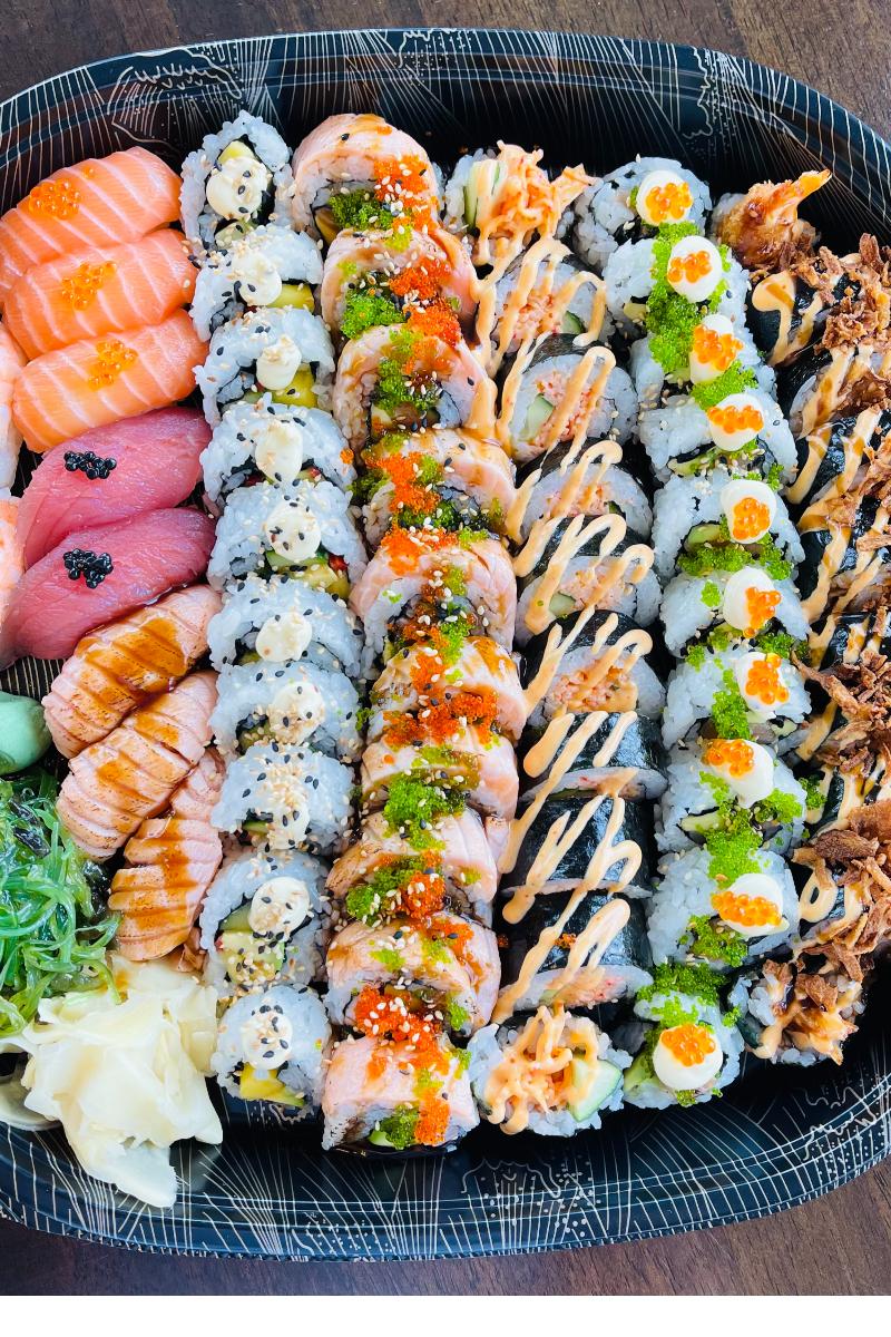 10 bit california rull. fylt med laks og tunfisk tartar (veldig lite tunfisk), smakt med sesam og vårløk. toppet med grønn tobikko, trøffelmajones, sesamfrø og ørretrogn.