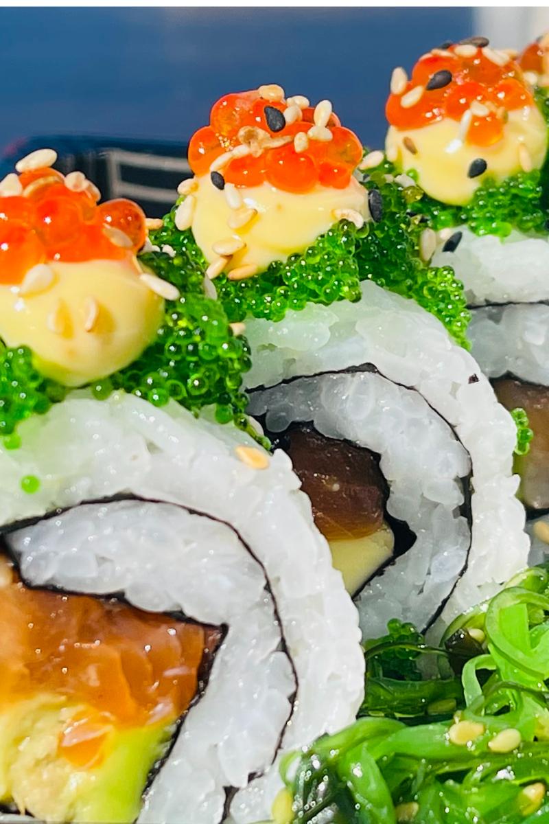 10 biter fylt med laksetartar med tunfisk og avocado. toppet med trøffelmajones og ørretrogn