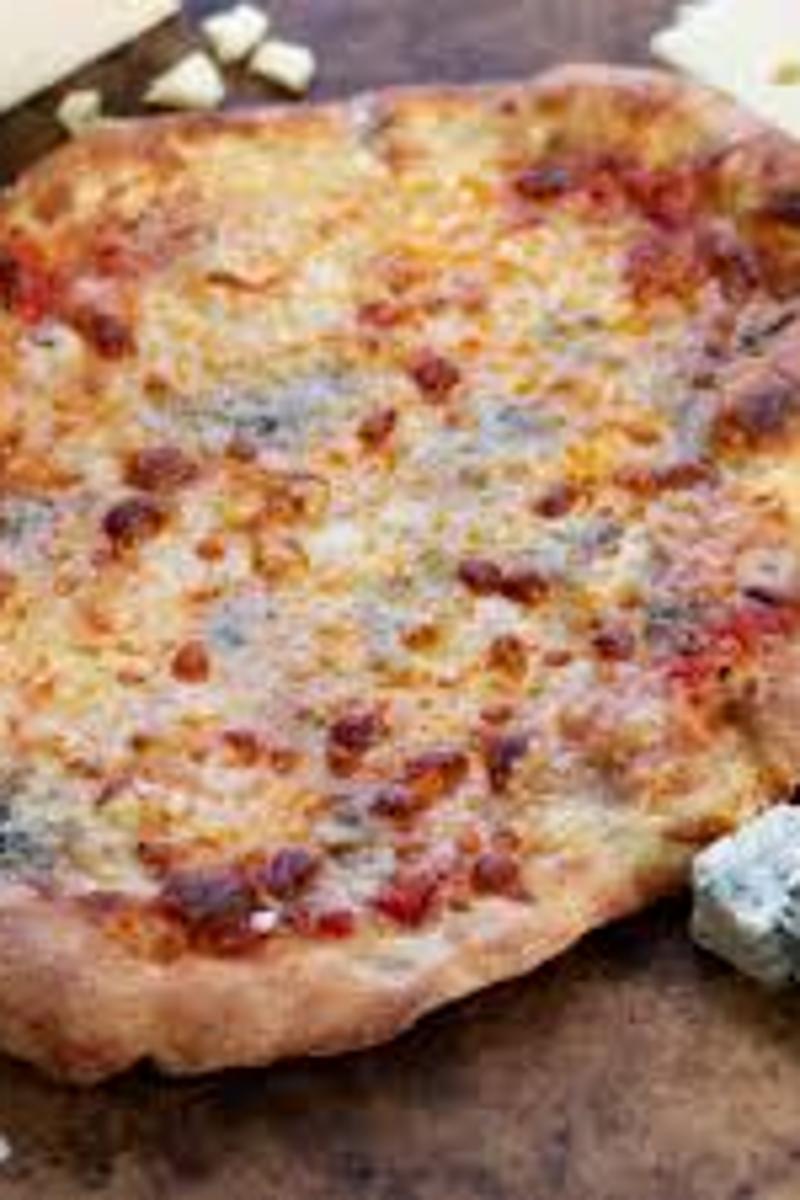 Surdeigsbunn med tomatsaus toppet med revet mozzarella, fersk mozzarella, cheddar og gorgonzola. olivenolje og basilikum