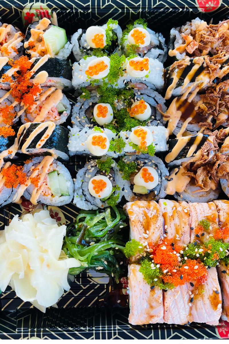 10 bit california rull. fylt med laks og tunfisk tartar (veldig lite tunfisk), smakt med sesam og vårløk. toppet med grønn tobikko, trøffelmajones, sesamfrø og ørretrogn.