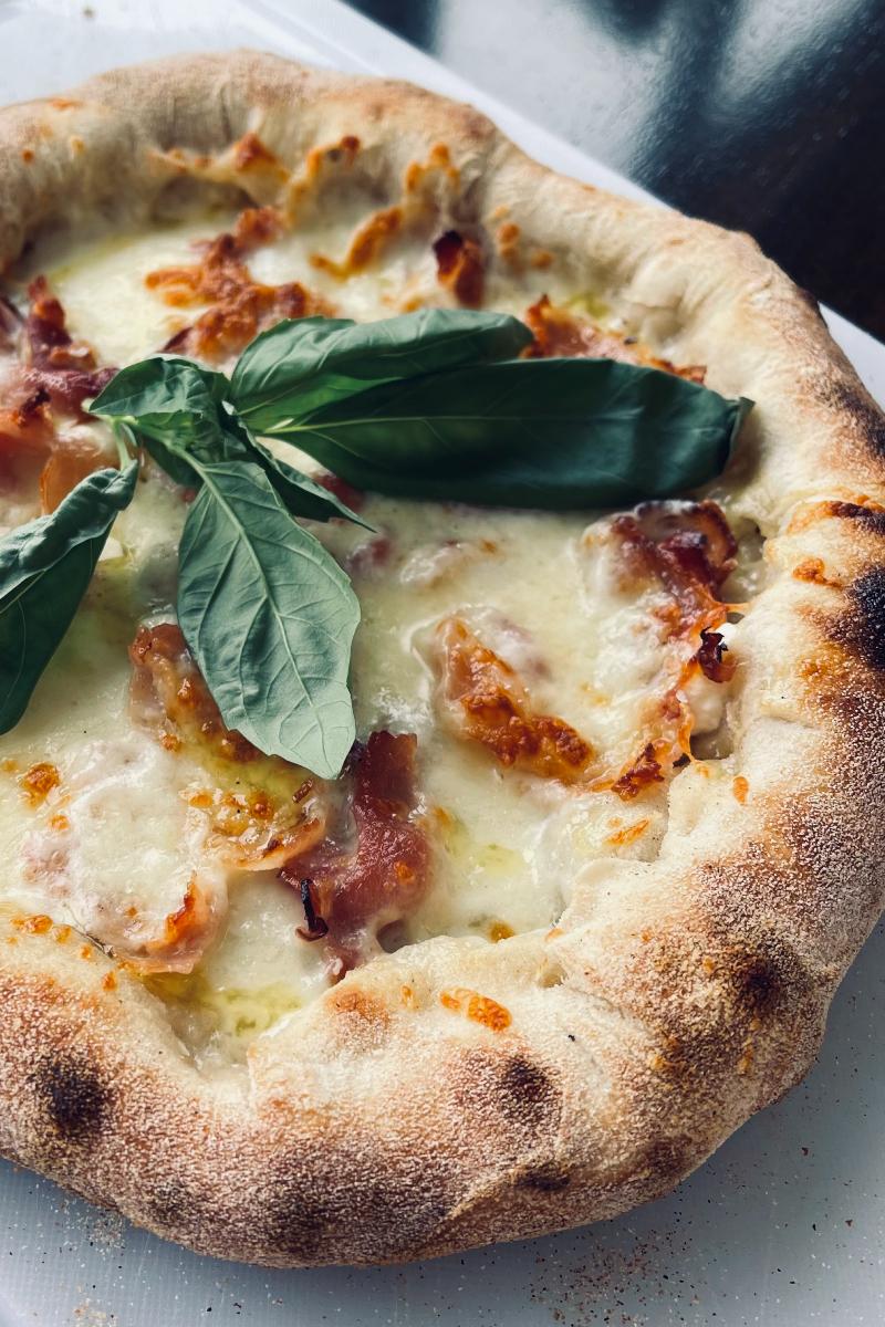 Surdeigspizza med revet mozzarella, Bacon, mascarpone, olivenolje og basilikum.